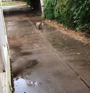Despite the heavy rain, Hazel refused to give up on the frightened kitten. It was a long journey, but eventually, they made it to the front of the house.