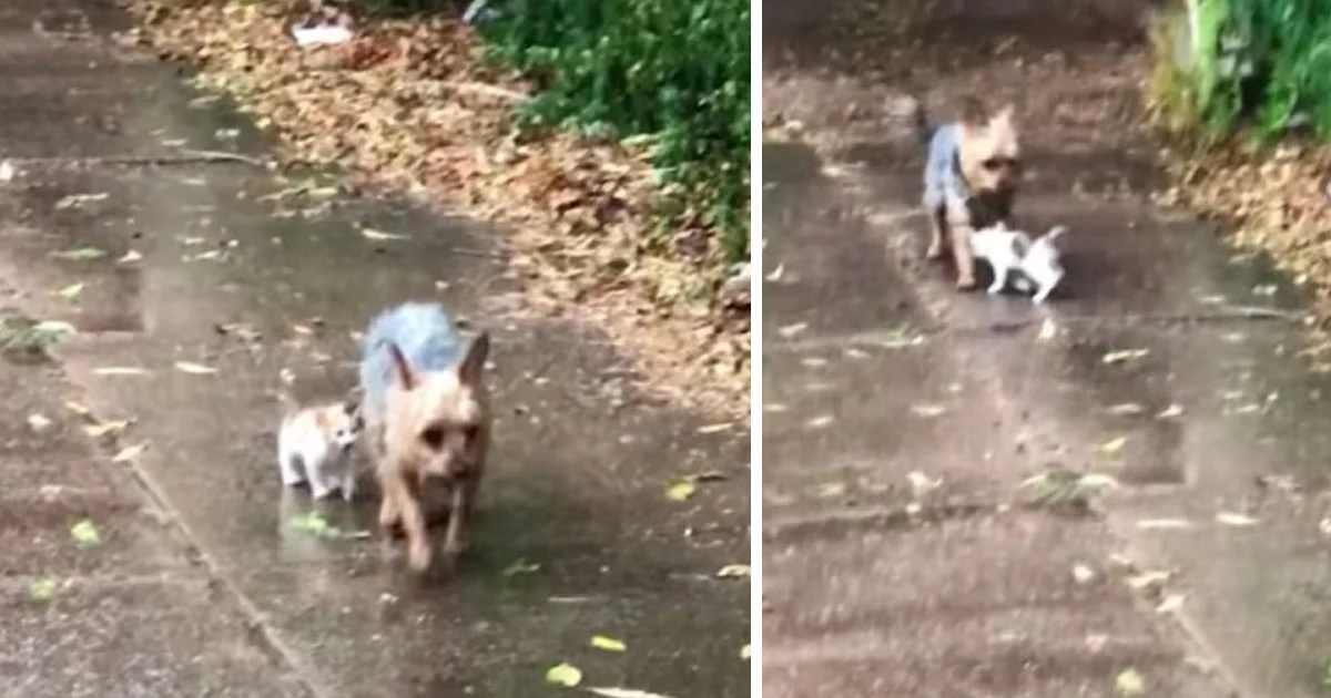 Rewritten Source: https://animalchannel.co/yorkie-saves-kitten-rain/