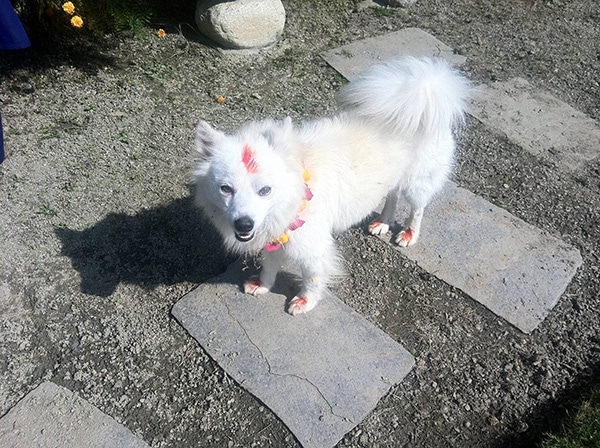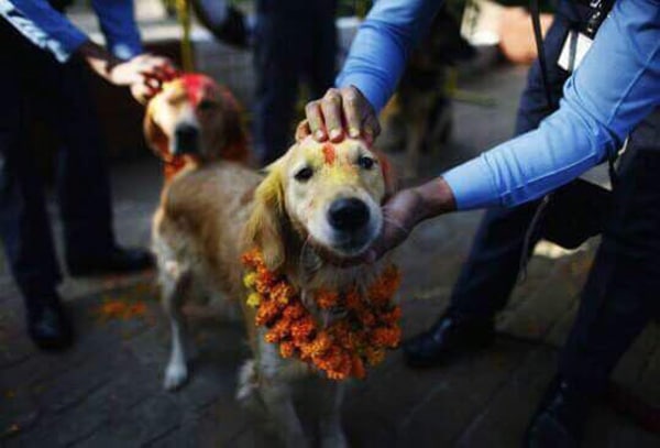 During the festival, dogs receive a “Tika,” a red mark on their forehead as a blessing. They are adorned with flower garlands and offered food as part of the celebration.